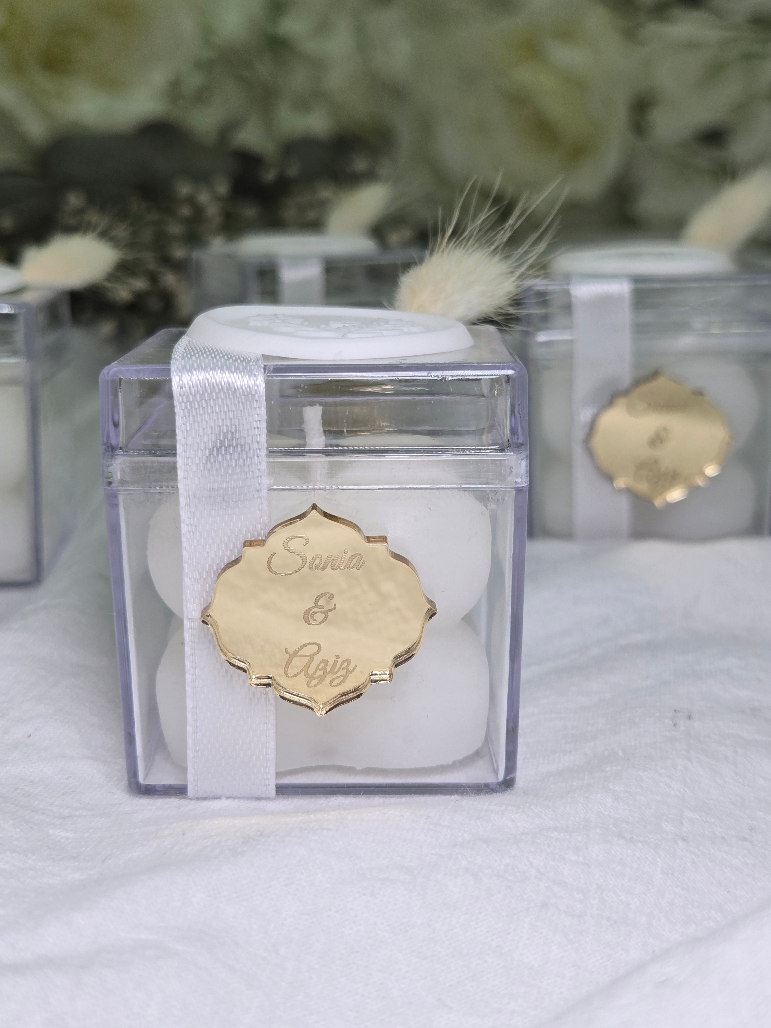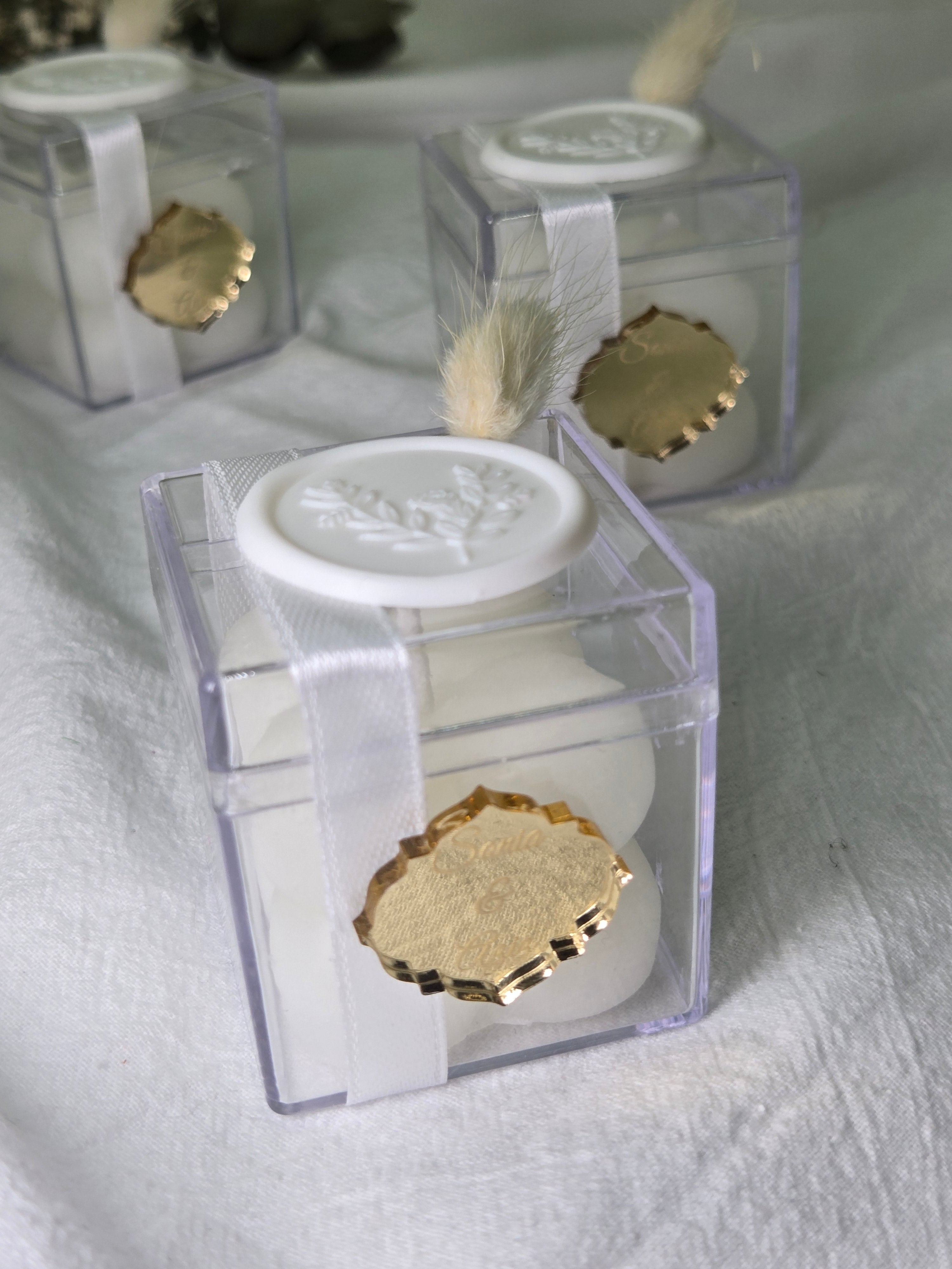Apportez une touche raffinée à vos événements avec ces bougies artisanales présentées dans un élégant cube transparent, fermées avec un couvercle scellé, un ruban blanc satiné, et une plaque dorée personnalisée au prénom(s) de votre choix.