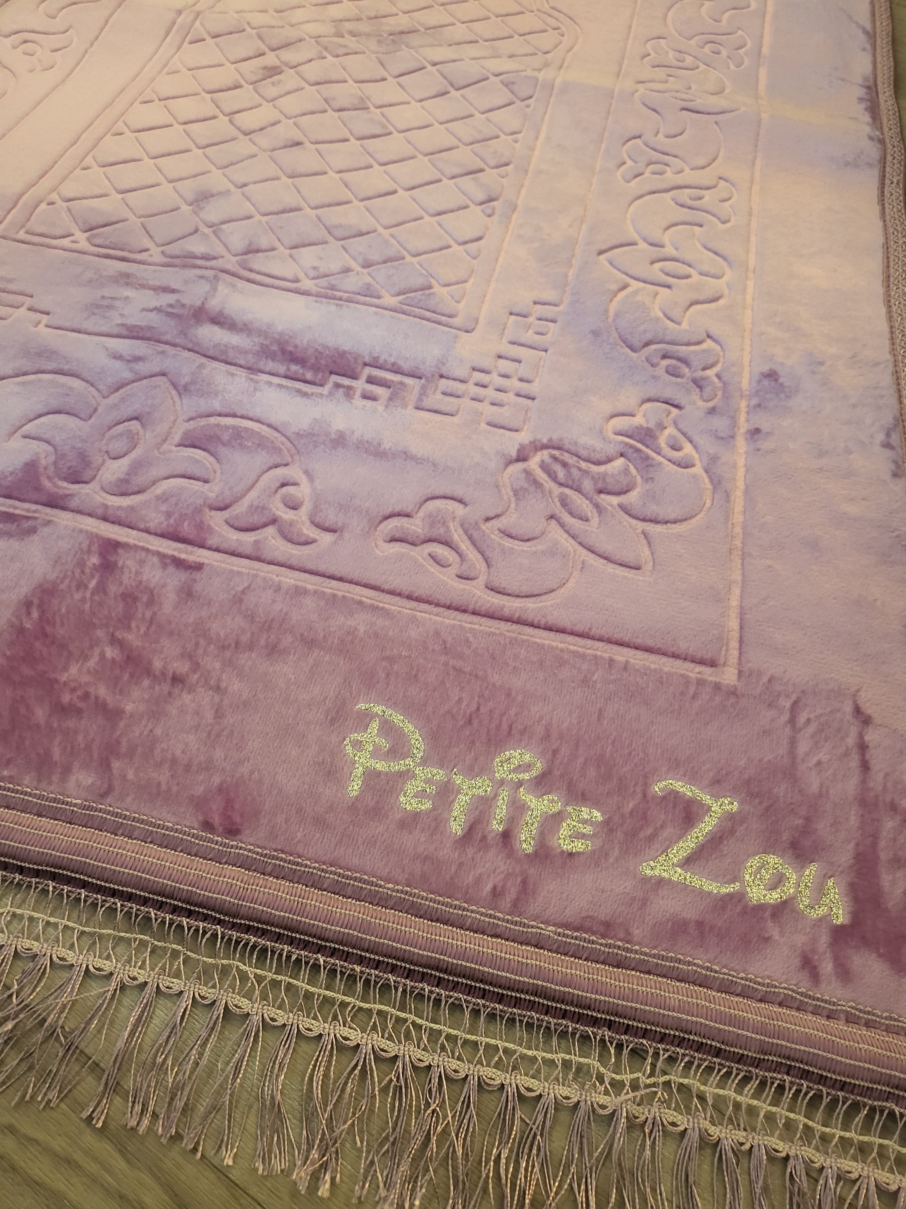 ♥ La personnalisation que nous réalisons sur le tapis de prière en peluche se fait avec du flex thermocoller donc lavage à 30° maximum ou a la main a froid.